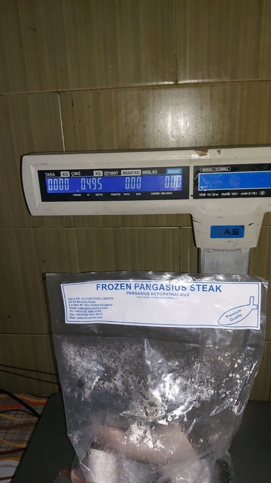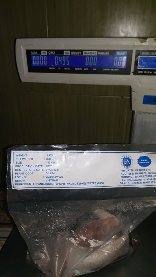 Yoxlama zamanı istehsal tarixi 08.05.2019-cu il, son istifadə tarixi 07.05.2021-ci il olan Vyetnam mənşəli panqasius balığının etiket məlumatlarında məhsulun çəkisi 1 kq, donu açıldıqdan sonra qalan çəkisi 800 q göstərilsə də, donu açılmış məhsulun faktiki çəkisinin 495-510 qram olduğu müəyyən edilib və məhsulun satışı dərhal dayandırılıb.