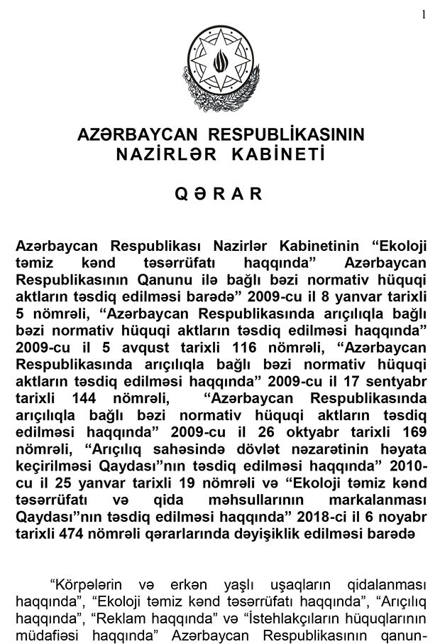 Qərarda “Arıçılıq haqqında” qanuna edilmiş dəyişiklik isə arıçılıq məhsullarının istehsalı zamanı istifadə olunan avadanlıq və vasitələrin ekoloji təmiz standartlara uyğunluğu üçün sertifikat və baytarlıq şəhadətnaməsi alınmasını nəzərdə tutur. Yəni qərar arıçılıq sahəsində baytarlıq nəzarətini də tənzimləyəcək. Qərar arıçılıq məhsullarının gigiyenik standartlara uyğunluğuna dair normativləri də müəyyənləşdirir.