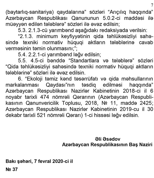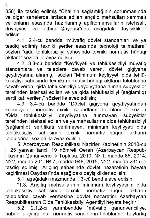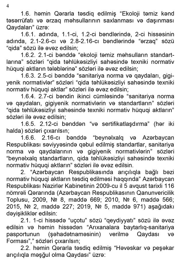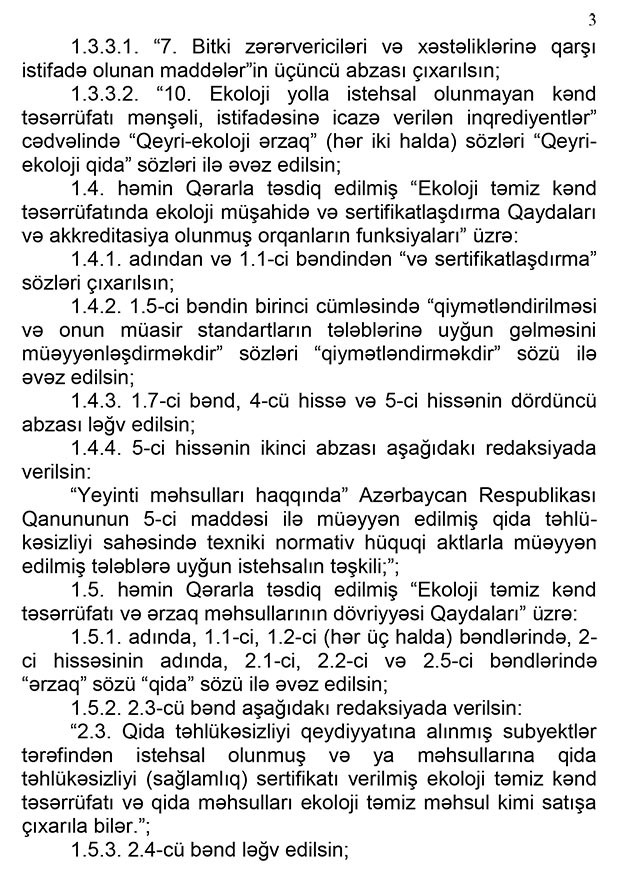 Qərarda həmçinin “Ekoloji təmiz kənd təsərrüfatı haqqında” qanuna da dəyişiklik nəzərdə tutulur. Dəyişikliklərə əsasən, ekoloji təmiz qida məhsulları istehsal etmək niyyətində olan şirkətlər bunun üçün quraşdırdıqları avadanlıqlara da müvafiq sertifikatlar almalıdır. Yalnız bu halda həmin şirkətin istehsal etdiyi qida məhsulu ekoloji təmiz məhsul kimi satışa çıxarıla bilər.