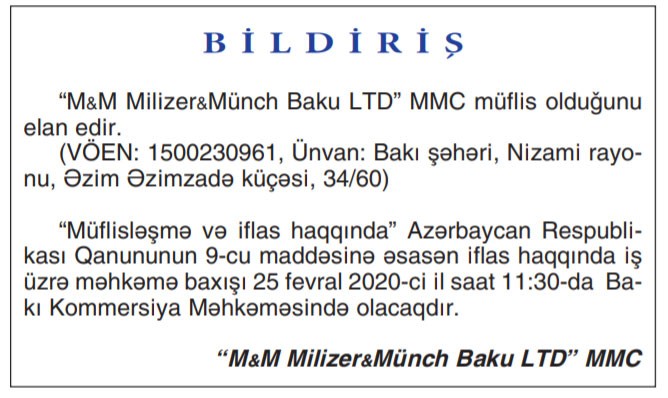 Qlobal nəqliyyat və logistika şirkəti “M&M Militzer and Münch”in Azərbaycandakı nümayəndəliyi “M&M Militzer & Münch Baku LTD” MMC müflis olunduğunu elan edib.