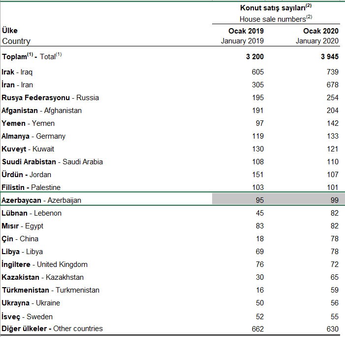 “Marja” Türkiyənin Statistika Komitəsinə istinadən xəbər verir ki, 2020-ci ilin Yanvar ayında azərbaycanlılar Türkiyədə 99 mənzil alıblar. 2019-cu ilin Yanvar ayında azərbaycanlılar Türkiyədə 95 mənzil almışdılar.