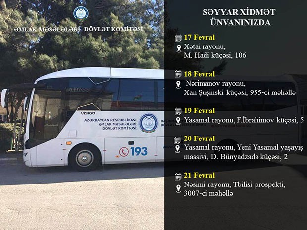 “Əmlakını qeydiyyata al və mülkiyyətinə sahib ol” kampaniyası çərçivəsində səyyar xidmət 17 fevralda Xətai rayonu, M. Hadi küçəsi, 106, 18 fevralda Nərimanov rayonu, Xan Şuşinski küçəsi, 955-ci məhəllə ünvanlarında olacaq. Yasamal rayonunda davam edən kampaniya 19 fevralda F. İbrahimov küçəsi, 5, 20 fevralda Yeni Yasamal yaşayış massivi, D. Bünyadzadə küçəsi, 2 ünvanlarındakı binalarda keçiriləcək. Fevralın 21-i isə mobil qeydiyyat xidməti Nəsimi rayonu, Tbilisi prospekti, 3007-ci məhəllə ünvanında yerləşən binada göstəriləcək.