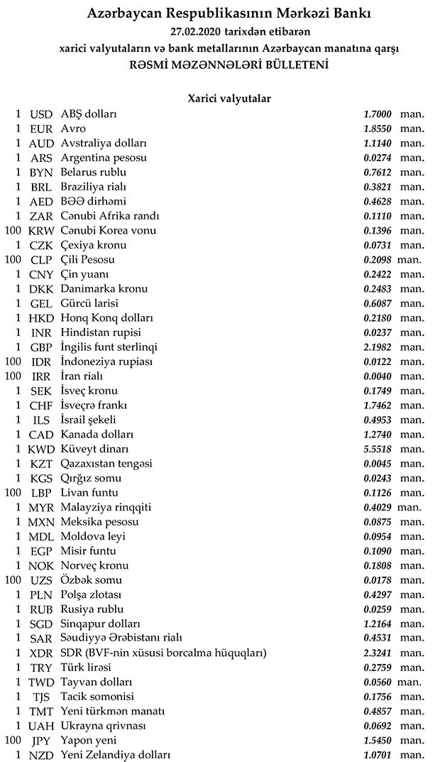 2020-ci ilin Fevral ayının 27-nə Mərkəzi Bankın açıqladığı rəsmi Dollar/Manat məzənnəsi Fevralın 26-sı ilə müqayisədə dəyişməyərək 1,7000 manatda qalıb, Avro/manat məzənnəsi 1.8550 manata qalxıb, Rubl/manat məzənnəsi isə 0,0259 manata düşüb.