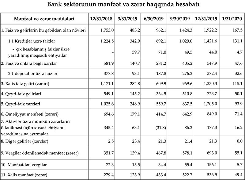 Azərbaycanın bank sektoru 2020-ci ilin Yanvar ayının 49,4 milyon manat xalis mənfəət ilə başa vurub. Halbuki, bu sektor 2019-cu ilin Yanvar ayını 42,6 milyon manat xalis mənfət ilə başa vurmuşdu. Beləliklə, sektorun xalis mənfəəti 16% artıb.