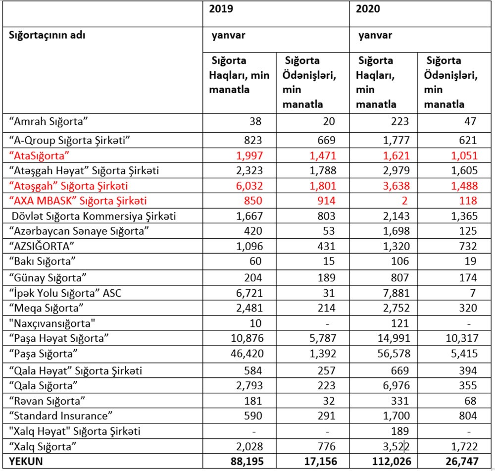 Yanvar ayında sığorta haqları 3 şirkətdə azalıb, 18 şirkətdə artıb. Bir şirkət ötən ilin Yanva ayında sığorta haqları hesablamadığı halda, 2020-ci ilin yanvar ayında hesablayıb.