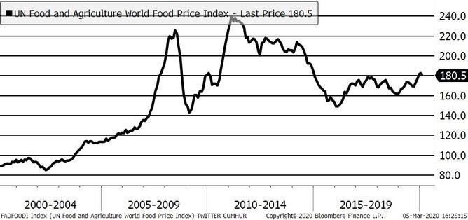 Qlobal qida qiymətləri, qismən koronavirus (COVID-19) epidemiyasının qlobal tələbi yavaşladacağına dair narahatlıqlar və bitki yağlarının ixrac qiymətlərindəki azalma səbəbilə dörd ay sonra ilk dəfə Fevral ayında düşüb.