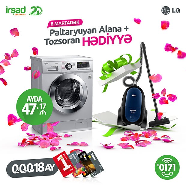 Hədiyyə üçün məişət texnikası seçmək qərarınız LG paltaryuyanı üzərində dayanarsa, sizə tozsoran hədiyyə olunur və ilkin ödənişsiz, faizsiz, 18 ay ərzində ayda 55 manat 50 qəpik ödəməklə xanımınızın rahatlığını təmin edən bu vacib məişət texnikası ilə onu sevindirə bilərsiniz.