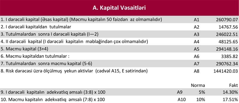 31 Mart 2017-ci il tarixinə “Kapital Bank” 3 milyard 132 milyon 312 min manat cəmi aktivlərə, 2 milyard 819 milyon 430 min manat cəmi öhdəliklərə, 312 milyon 883 min manat cəmi kapitala malik olub. 31 Dekabr 2016-cı il tarixinə “Kapital Bank” 3 milyard 96 milyon 690,92 min manat cəmi aktivlərə, 2 milyard 814 milyon 524,03 min manat öhdəliklərə, 282 milyon 166,89 min manat cəmi kapitala malik idi.