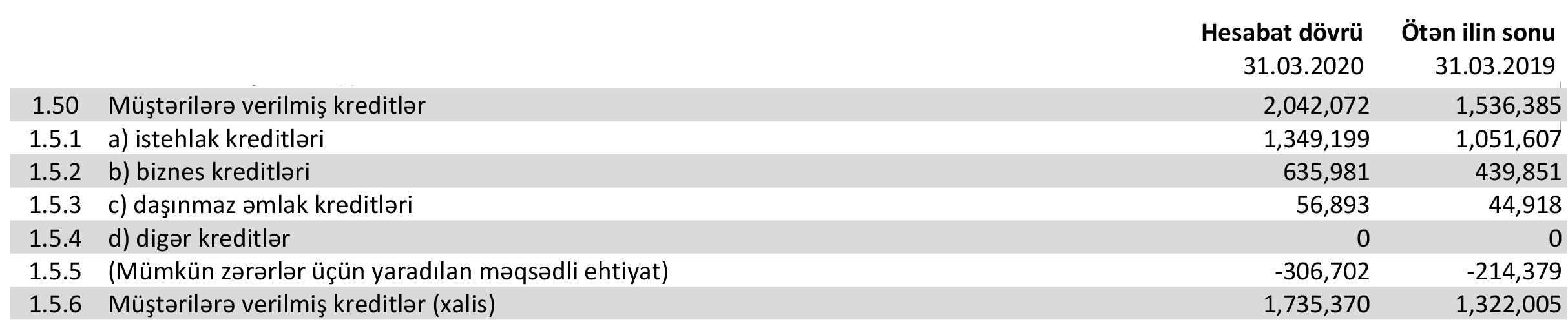 Belə ki, Bankın istehlak kreditləri portfeli 28,2% və ya 297 milyon 592 min manat artaraq 30 Mart 2020-ci il tarixində 1 milyard 349 milyon 199 min manata çatıb. Bu məbləğ ötən ilin eyni tarixində 1 milyard 51 milyon 607 min manata idi.