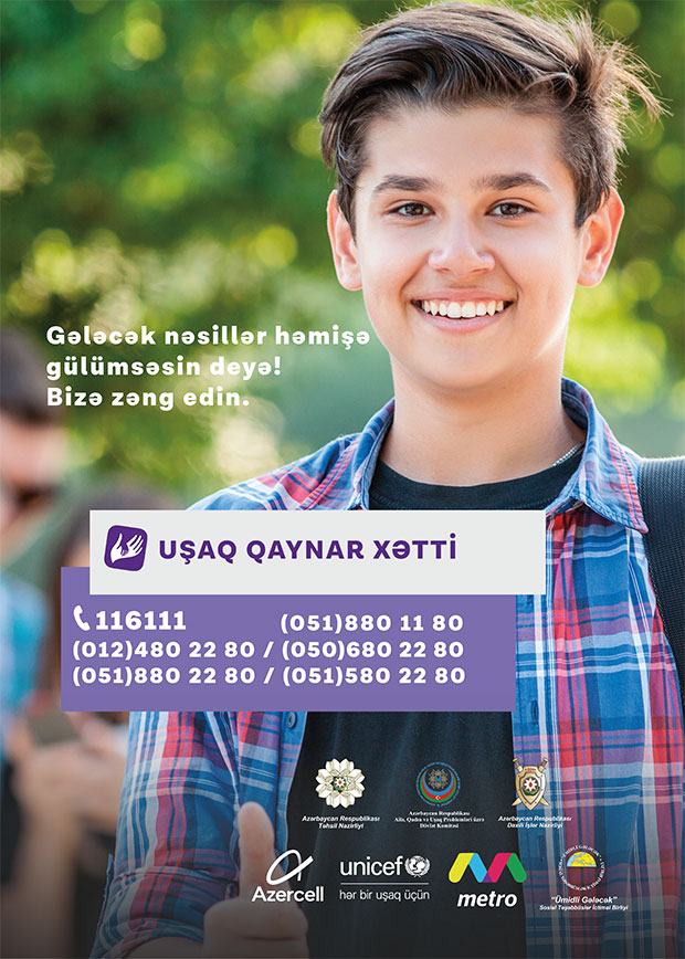 Qeyd edək ki, "Azercell Telekom" MMC-nin dəstəyi, "Ümidli Gələcək İctimai Birliyi"nin təşkilatçılığı ilə 7/24 rejimi ilə fəaliyyət göstərən Uşaq Qaynar Xətt xidmətinə həm şəhərdaxili, həm də Azercell nömrələrindən edilən zənglər ödənişsizdir. Uşaq Qaynar Xətt xidmətinə daxil olan bütün məlumat məxfi saxlanılır.
