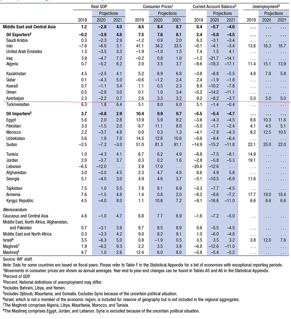 Beynəlxalq Valyuta Fondu koronavirusun yayılması şəraitində 2020-ci ildə Azərbaycan iqtisadiyyatında 2,2% səviyyəsində azalma olacağını proqnozlaşdırır.