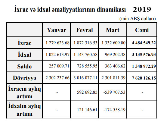 2019-cu ilin Yanvar ayında ixracın həcmi 1 milyard 279 milyon dollar, Fevralda 1 milyard 872 milyon dollar, Martda isə 1 milyard 333 milyon dollar təşkil etməklə cəmi 4 milyard 484 milyon dollar olmuşdu.