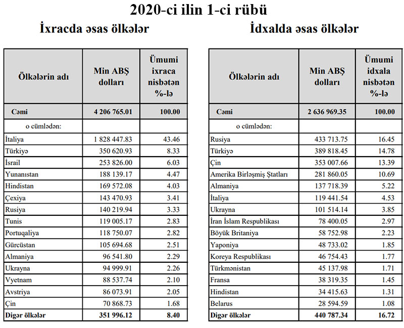 2020-ci ilin ilk rübündə Azərbaycana Rusiyadan 433 milyon 713 min dollarlıq mallar idxal olunub. Bu, ötən ilin eyni dövrü ilə müqayisədə 4 milyon 10 min dollar azdır. 2019-cu ilin 1-ci rübündə Rusiyadan 437 milyon 723 min dollarlıq idxal həyata keçirilmişdi.