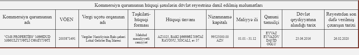 2016-cı ilin iyun ayında Vergilər Nazirliyi “CMS Properties” MMC-ni 23 milyon manat nizamnamə kapitalı ilə qeydiyyata alıb. Hazırda Şirkətin rəsmi nümayəndəsi Eyvaz Eyvazovdur.