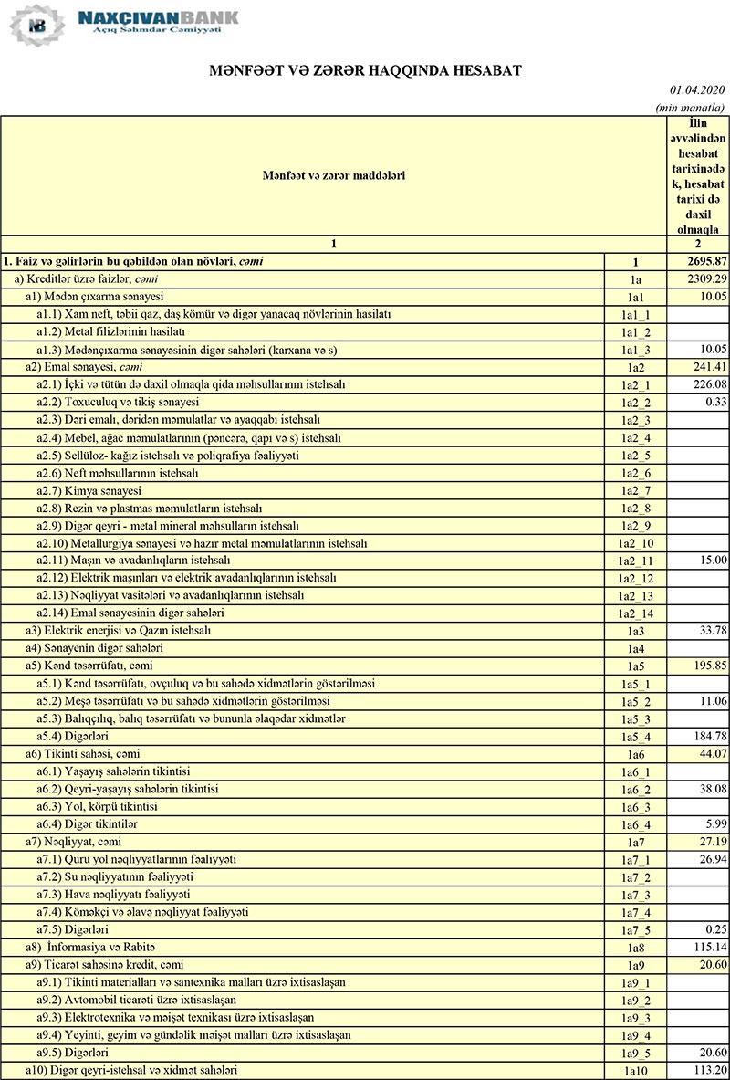 Ötən ilin ilk rübündə 1 milyon 511 min manat təşkil etmiş faiz gəlirləri, 2020-ci ilin ilk rübündə 2 milyon 695 min manat olub. Qeyri-faiz gəlirləri isə 708 min manatdan 1 milyon 279 min manata yüksəlib.