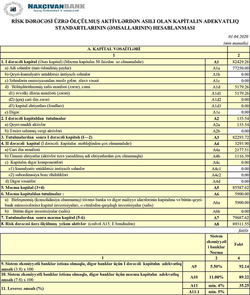 01.04.2020-ci il tarixində “Naxçıvanbank” 79 milyon 687 min manat məcmu kapitala malik olub.