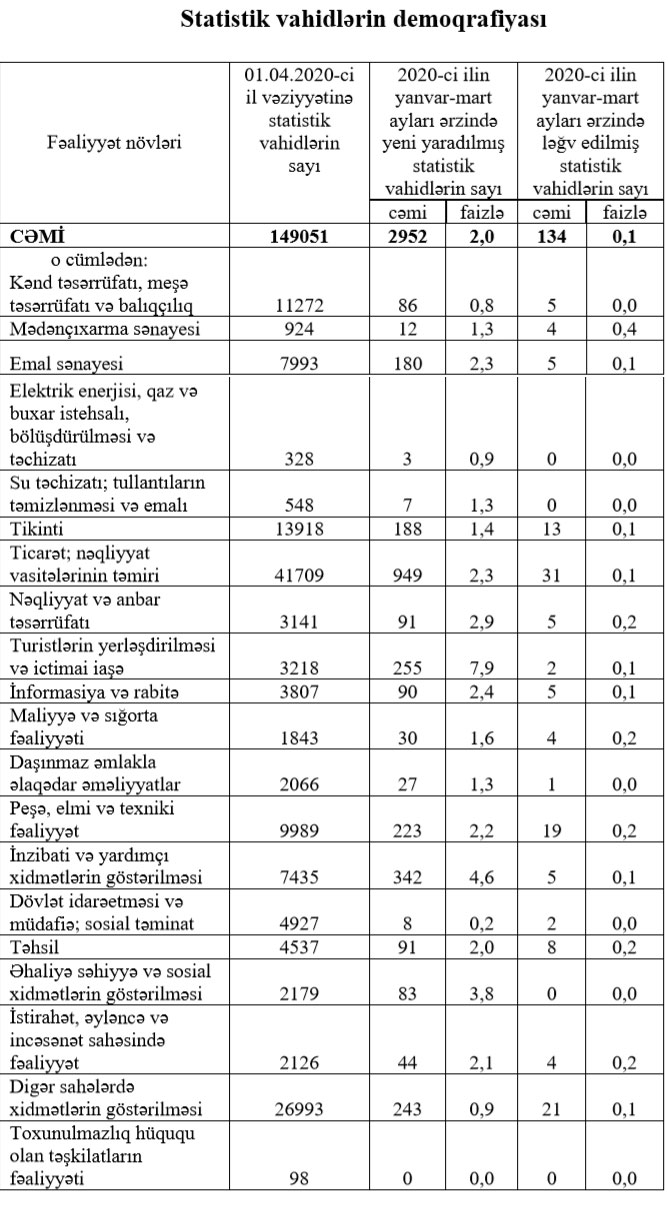 2020-ci ilin yanvar-mart ayları ərzində statistik vahidlərin (fərdi sahibkarlar istisna olmaqla) sayı 1,9 faiz artaraq 2020-ci il aprelin 1-i vəziyyətinə 149 min 51 olmuşdur.