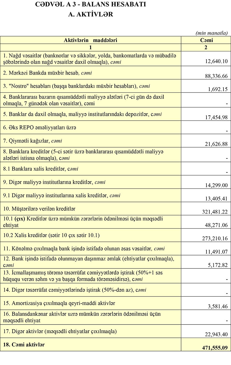 31 Mart 2020-ci il tarixində “Yelo Bank” 471 milyon 555 min manat cəmi aktivlərə malik olub, aktivlərin 321 milyon 481 min manatını müştərilərə verilən kreditlər təşkil edib. Qeyd edək ki, ötən ilin sonunda Bankın cəmi aktivləri 484 milyon 727 min manata, müştərilərə verilən kreditlər isə 304 milyon 348 min manata çatmışdı. Mərkəzi Bankda müxbir hesabın kəskin azalması cəmi aktivlərin də azalmasına səbəb olub.