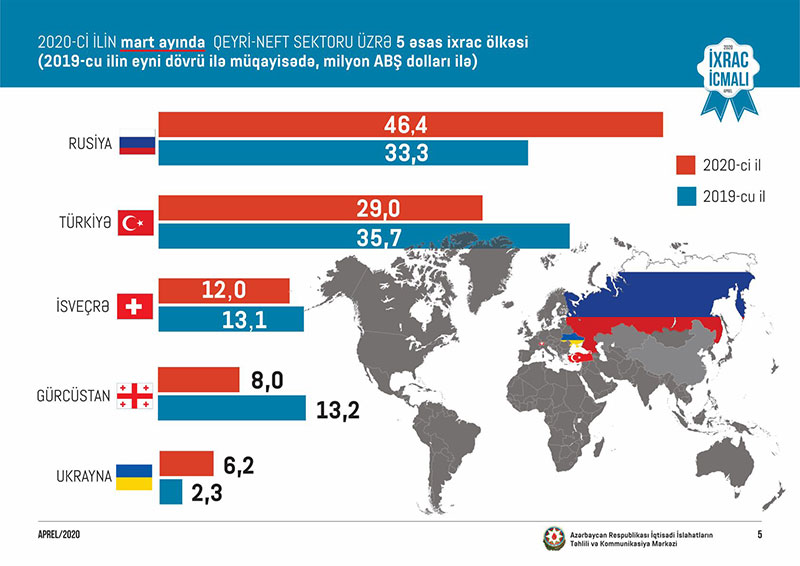 2019-cu ilin müvafiq dövrü ilə müqayisədə 2020-cu ilin birinci rübündə Rusiyaya qeyri-neft ixracı 16,6 faiz, Türkiyəyə 5,2 faiz, İsveçrəyə 21,1 faiz və Çinə 18,4 faiz artıb.