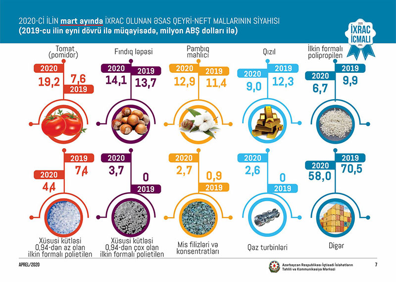 2020-ci ilin mart ayında isə qeyri-neft sektoru üzrə ixrac 133 milyon ABŞ dolları təşkil edib. Bu ilin mart ayında qeyri neft-qaz məhsulları ən çox mal Rusiyaya (46,4 milyon ABŞ dolları), Türkiyəyə (29 milyon ABŞ dolları), İsveçrəyə (12 milyon ABŞ dolları), Gürcüstana (8 milyon ABŞ dolları) və Ukraynaya (6,2 milyon ABŞ dolları) ixrac edilib.