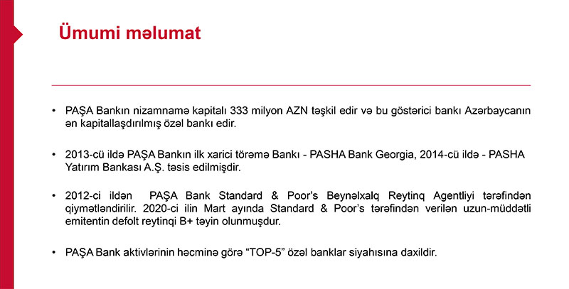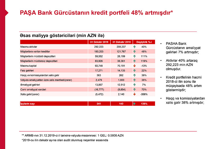 PAŞA Bank, 31 dekabr 2019-cu il tarixinə bitən il üzrə özünün və törəmə banklarının (PASHA Bank Georgia və PASHA Yatırım Bankası A.Ş.) maliyyə nəticələrini mətbuat konfransında açıqladı.