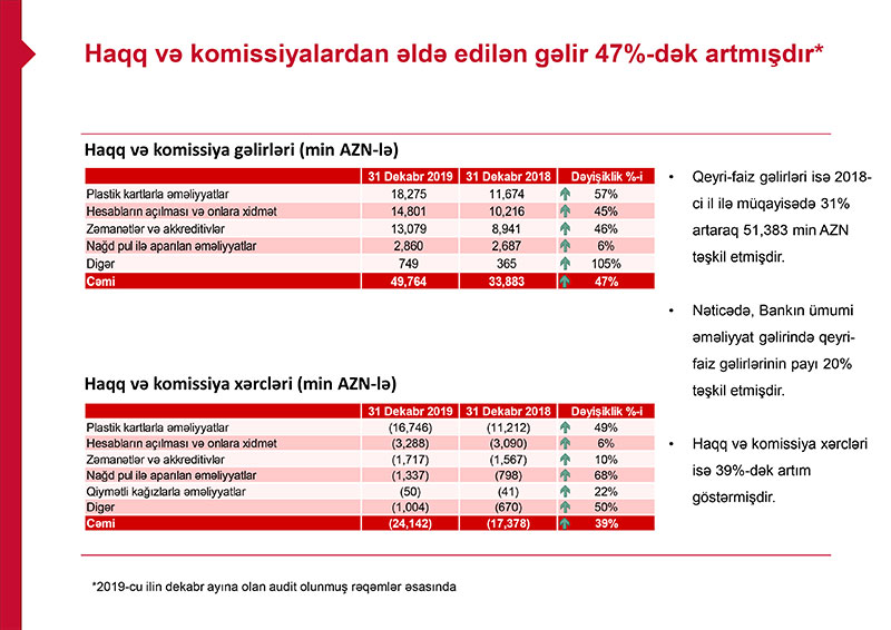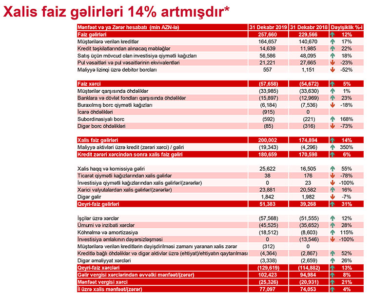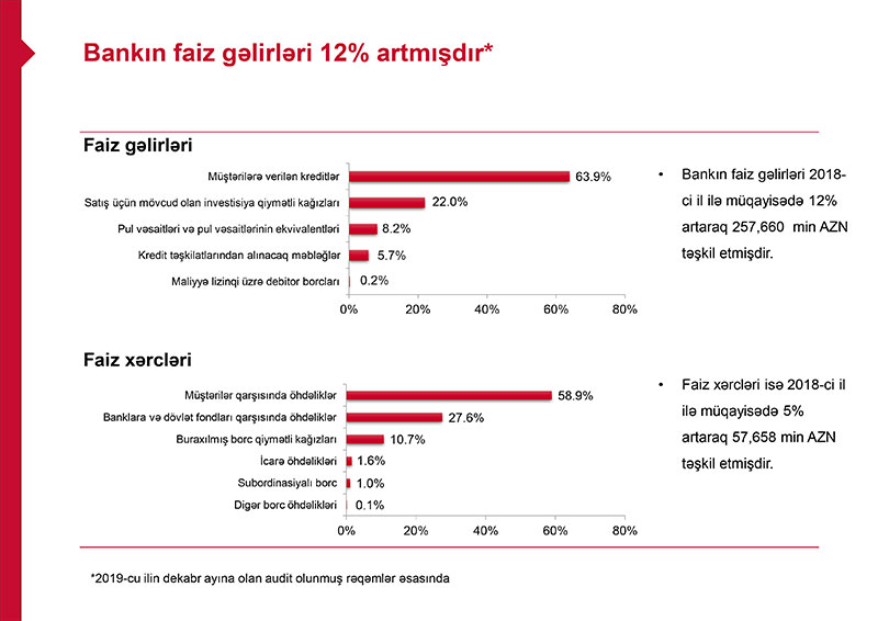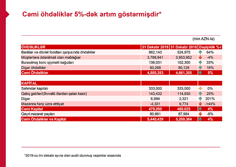 Müştəri depozitləri əsasən tələbli və müddətli hesablarda müvafiq olaraq 57% və 43 % nisbətində cəmlənmişdir (2018: 75% and 25%). Bank 2019-ci maliyyə ili üçün 77,097 min manat xalis mənfəət (2018: 74,053 min manat) elan etmişdir. Eyni dövr üçün toplam əməliyyat gəlirləri 251,385 min manat olmuşdur ki, bu göstərici keçən ilin müvafiq dövrü ilə müqayisədə 17% çoxdur (2018: 214,162 min manat). Bankın faiz gəlirləri 257,660 min manat, qeyri-faiz gəlirləri 51,383 min manat təşkil etmişdir. Nəticədə qeyri-faiz gəlirinin ümumi əməliyyat gəlirlərinə nisbəti 20% olmuşdur.