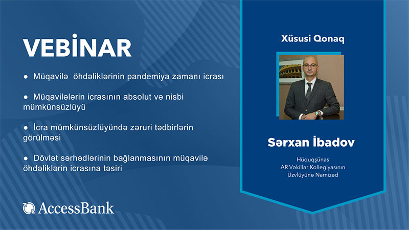 “AccessBank”ın növbəti vebinarı isə pandemiya dönəmində hüquqi məsələlərin həllinə həsr olunub. Vebinar hüquqşünas Sərxan İbadov tərəfindən aparılıb. Vebinarda fors-major hallar, sığorta hadisəsi, beynəlxalq yükdaşıma və pandemiya zamanı yaranmış hüquqi məsələlərin doğru və zamanında həlli prosesləri kimi mövzular müzakirə olunub.