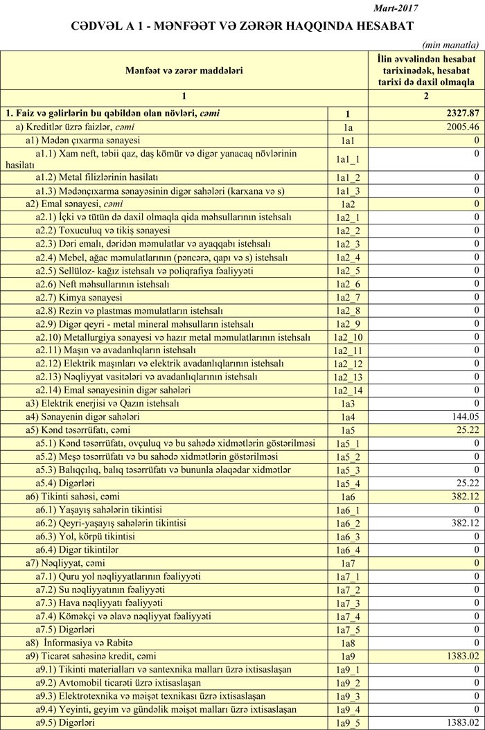 Ziraat Bank Azərbaycan 2017-ci ilin 1-ci rübünü 1 milyon 337.86 min manat xalis mənfəət ilə başa vurub.