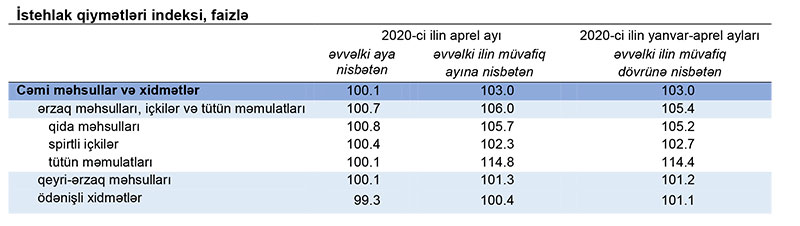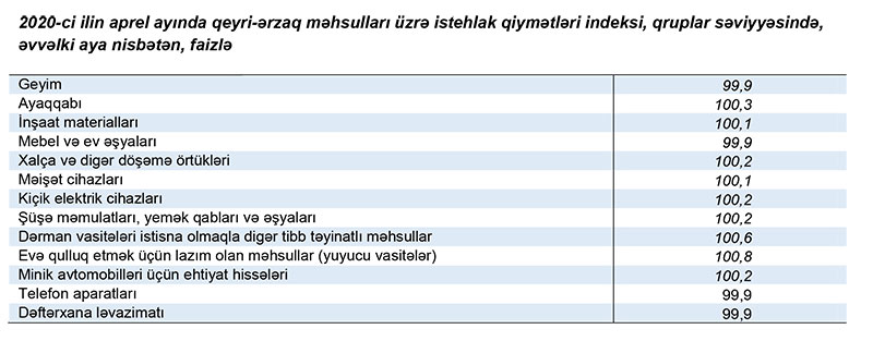 Cari ilin aprel ayında əvvəlki aya nisbətən ayrı-ayrı ərzaq məhsullarından daha çox bahalaşma düyünün, unun, qarabaşaq və manna yarmasının, makaron məmulatlarının, mal, qoyun və toyuq ətinin, kolbasa məmulatlarının, sterilizə olunmuş üzlü südün, qatılaşdırılmış şəkərli südün, yoqurtun, xamanın, kəsmiyin, tərkibində qursaq mayası olan bərk və yumşaq pendirin, süfrə marqarininin, limonun, portağalın, naringinin, almanın, armudun, heyvanın, narın, kivinin, şabalıdın, kələmin, balqabağın, bibərin, çuğundurun, yerkökünün, sarımsağın, kartofun, mərcinin, şəkər tozunun, qəhvənin, arağın, pivənin, ucuzlaşma isə əsasən təzə balığın, pasterizə olunmamış üzlü südün, yumurtanın, zeytun yağının, bananın, qozun, fındığın, xiyarın, pomidorun, göyərtinin, soğanın qiymətlərində müşahidə olunmuşdur. Digər ərzaq məhsullarının qiymətlərində ciddi dəyişikliklər baş verməmişdir. 2020-ci ilin aprel ayında qeyri-ərzaq məhsulları üzrə istehlak qiymətləri indeksi əvvəlki aya nisbətən 100,1 faiz, əvvəlki ilin aprel ayına nisbətən 101,3 faiz təşkil etmişdir.