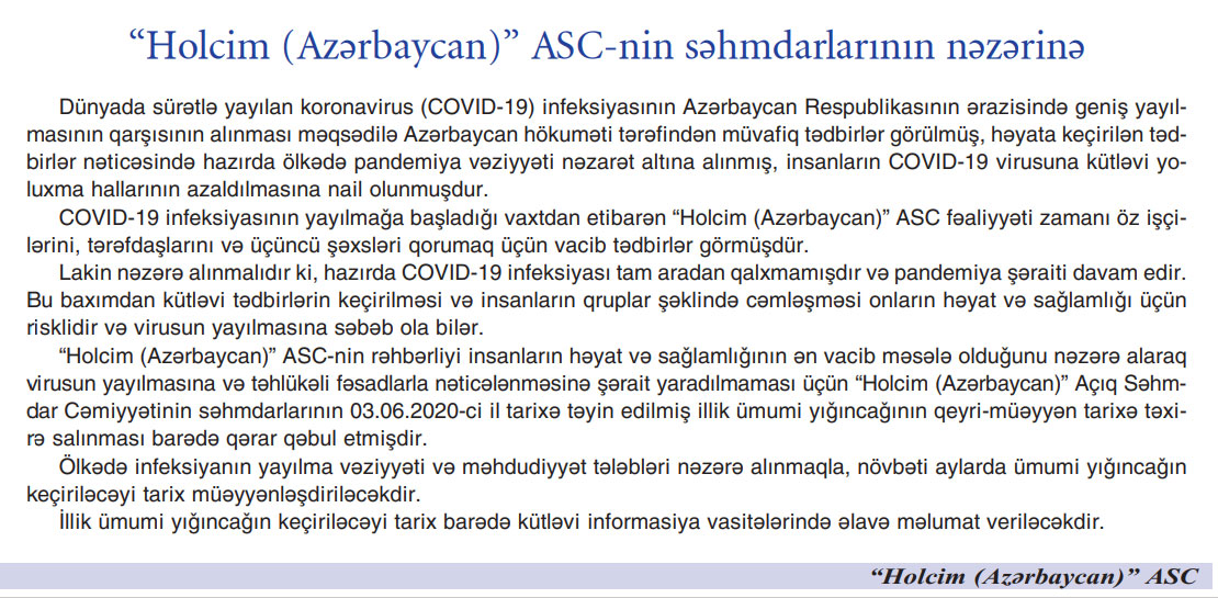 Sement istehsalçısı “Holcim Azərbaycan” ASC 03 İyun 2020-ci il tarixə təyin edilmiş səhmdarların illik ümumi yığıncağını qeyri-müəyyən müddətə təxirə salıb.
