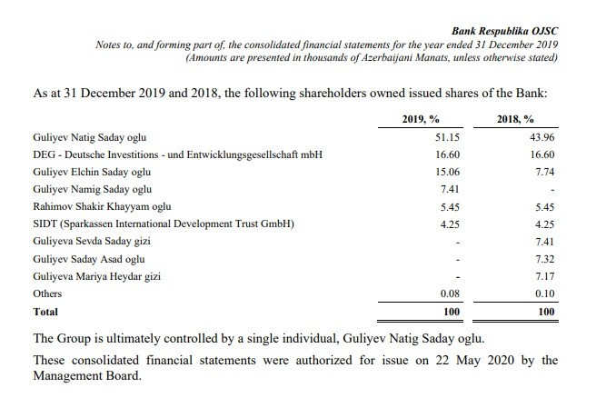 Almaniyanın DEG investisiya və "Sparkassen International Development Trust" şirkətlərinin, eləcə də “Bank Respublika”nın Müşahidə Şurasının sədri Şakir Xəyyam oğlu Rəhimovun payları isə dəyişməyərək müvafiq olaraq 16,6%, 4,25% və 5,45% qalıb.