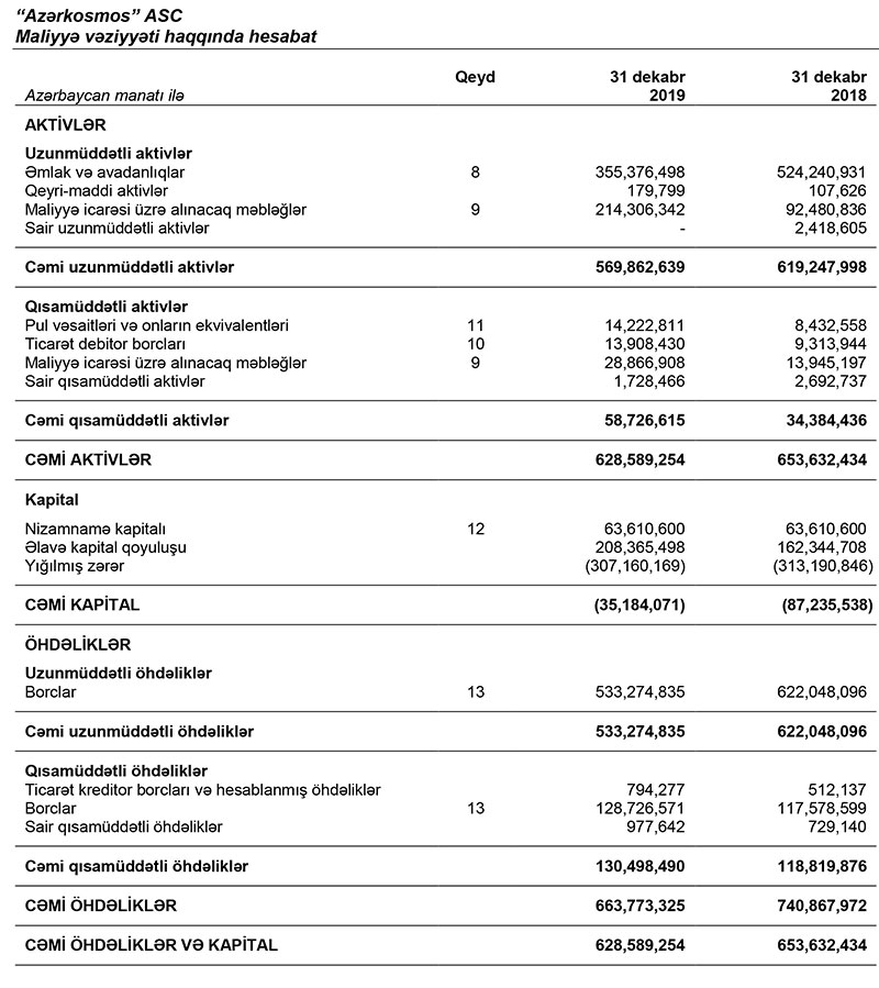 Maliyyə nəticələrini əks etdirən hesabata əsasən “Azərkosmos” 2019-cu ili 3,6 milyon manat xalis mənfəətlə başa vurub. Halbuki, dövlət şirləti 2018-ci ili 6,5 milyon manat xalis zərər ilə başa vurmuşdu.