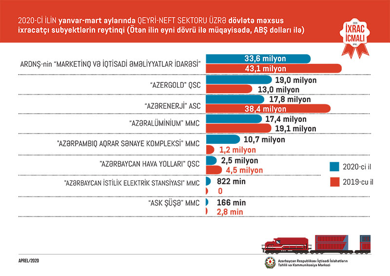 Qeyri-neft sektoru üzrə ixrac əməliyyatlarında iştirak edən dövlətə məxsus şirkətlərin siyahısına isə ARDNŞ-nin “Marketinq və İqtisadi Əməliyyatlar İdarəsi” başçılıq edir. Daha sonra bu siyahıda aşağıdakı şirkətlər təmsil olunurlar: "Azərenerji" ATSC, "Azəralüminium" MMC, "Azergold" QSC, "Azərpambıq Aqrar Sənaye Kompleksi" MMC, "Azərbaycan Hava Yolları" QSC, "Azərbaycan İstilik Elektrik Stansiyası" MMC, “Azərtütün Aqrar Sənaye Kompleksi” MMC, Naxçıvan MR Dövlət Energetika Xidməti və “ASK şüşə” MMC