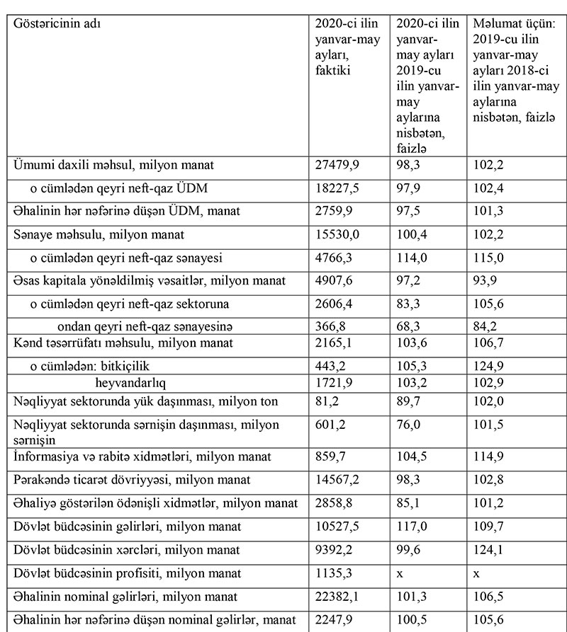 Dövlət Statistika Komitəsi 2020-ci ilin yanvar-may aylarında ölkənin iqtisadi və sosial inkişafının makroiqtisadi göstəricilərini açıqlayıb.