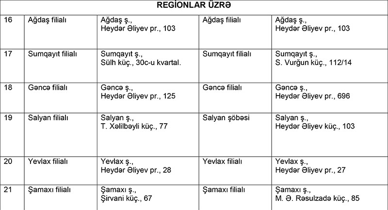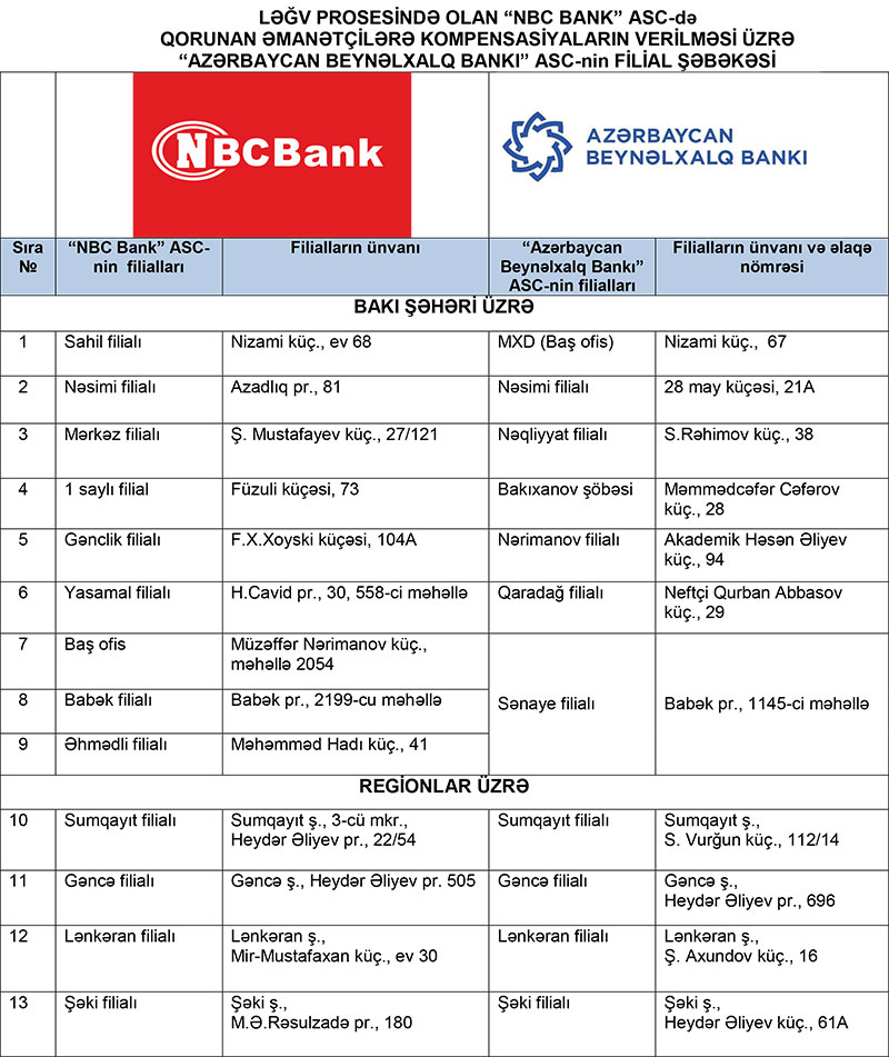 Əlavə olunan cədvələ uyğun olaraq qorunan əmanətçilər ləğv prosesində olan “AG Bank” ASC və “NBC Bank” ASC-də əmanətləri olduğu filialın qarşısında qeyd edilən “Azərbaycan Beynəlxalq Bankı” ASC-nin filialına müraciət edərək yuxarıda qeyd edilən sənədlər əsasında kompensasiyalarını əldə edə bilərlər.