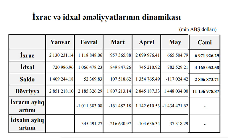 Müqayisə üçün qeyd edək ki, 2019-cu ilin ilk 5 ayı ərzində Azərbaycanın xarici ticarət dövriyyəsi 14 milyard 449 milyon 253 min dollar, o cümlədən ixrac 8 milyard 615 milyon 103 min dollar, idxal 5 milyard 834 milyon 150 min dollar təşkil etmiş, 2 milyard 780 milyon 952 min dollar xarici ticarət saldosu yaranmışdı.