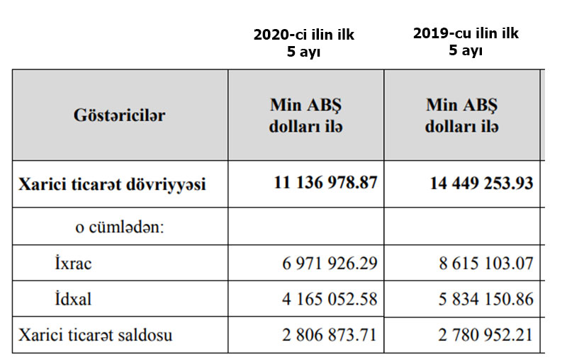 2020-ci ilin ilk 5 ayı ərzində (yanvar-may) Azərbaycanın xarici ticarət dövriyyəsi 11 milyard 136 milyon 978 min dollar, o cümlədən ixrac 6 milyard 971 milyon 926 min dollar, idxal isə 4 milyard 165 milyon 52 min dollar təşkil edib və 2 milyard 806 milyon 873 min dollar saldo yaranıb.