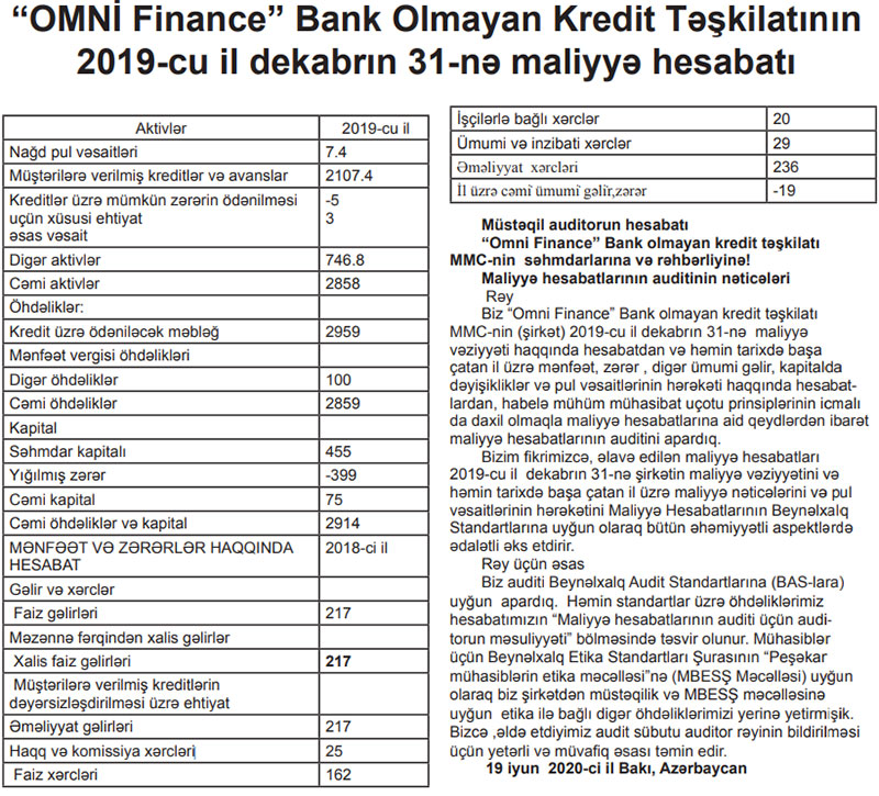 “OMNİ Finance” Bank Olmayan Kredit Təşkilatı 2019-cu ili 19 min manat zərər ilə başa vurub.