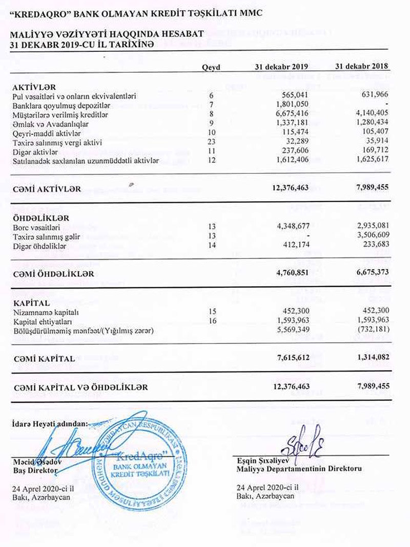Ötən il “Kredaqro”nun vergiyəqədərki mənfəəti 6 milyon 650 min manat (əvvəlki ilə nisbətən 29,7 dəfə çox), mənfəət vergisi ödəmələri isə 4 min manat (4 dəfə çox) təşkil edib.