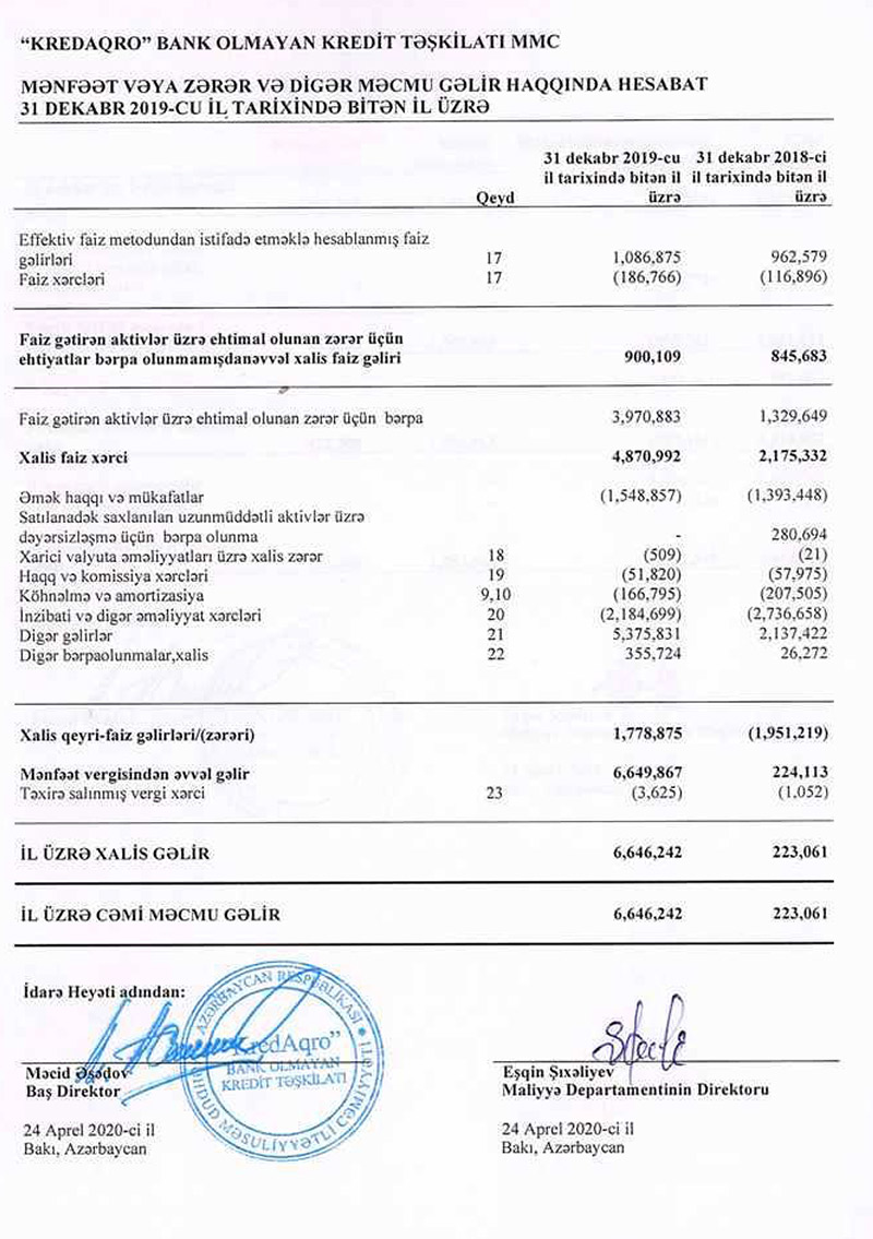 “Kredaqro” MMC bank olmayan kredit təşkilatı (BOKT) 2019-cu ili 6 milyon 646 min manat xalis mənfəətlə başa vurub.