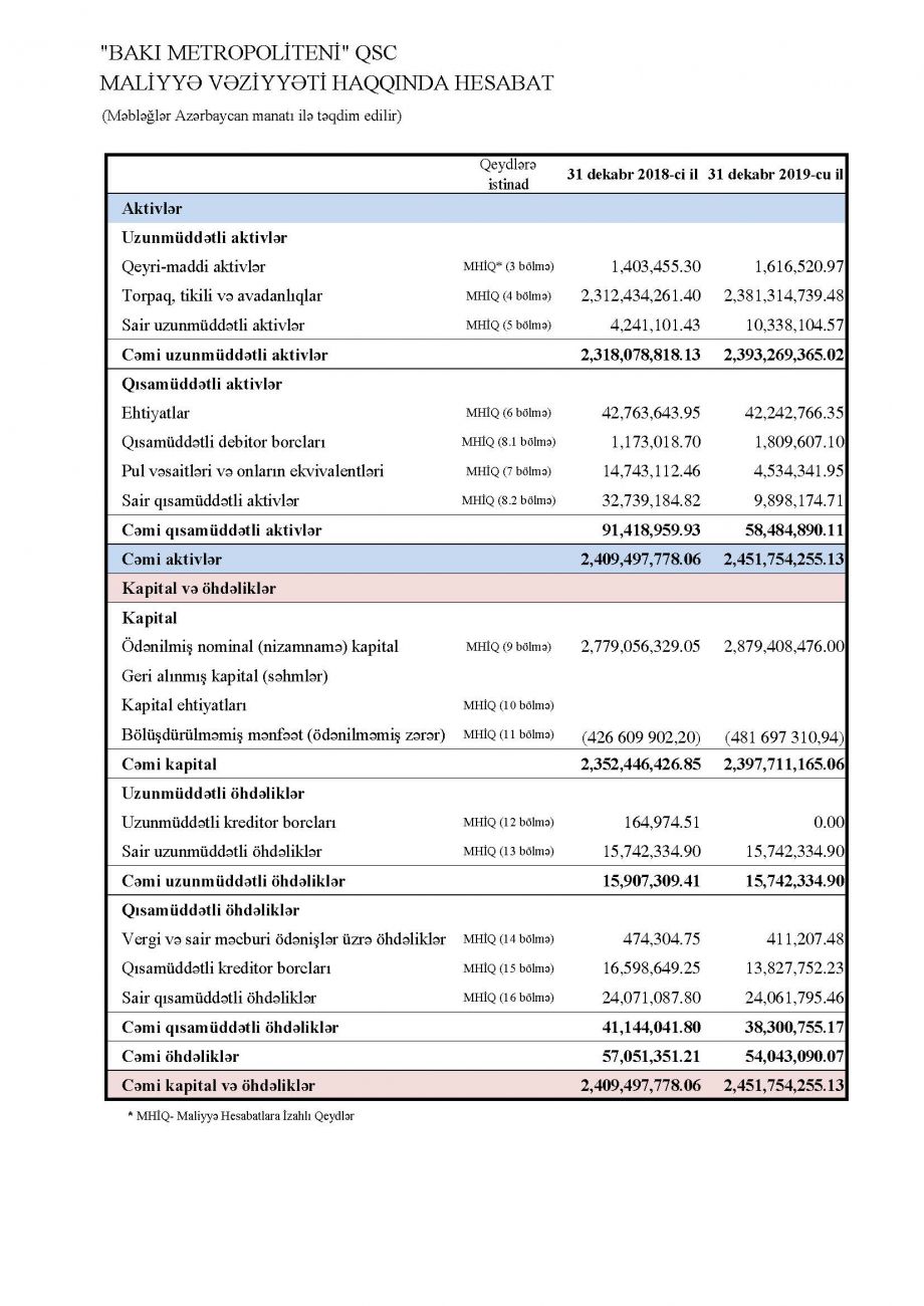 Bu il yanvarın 1-nə “Bakı Metropoliteni”nin aktivləri 2 milyard 451,8 milyon manat olub ki, bu da illik müqayisədə 1,75% çoxdur. Hesabat dövründə qurumun öhdəlikləri 5,3% azalaraq 54 milyon manata düşüb, balans kapitalı isə 1,9% artaraq 2 milyard 397,7 milyon manata, o cümlədən nizamnamə kapitalı 3,6% artaraq 2 milyard 879,4 milyon manata çatıb.