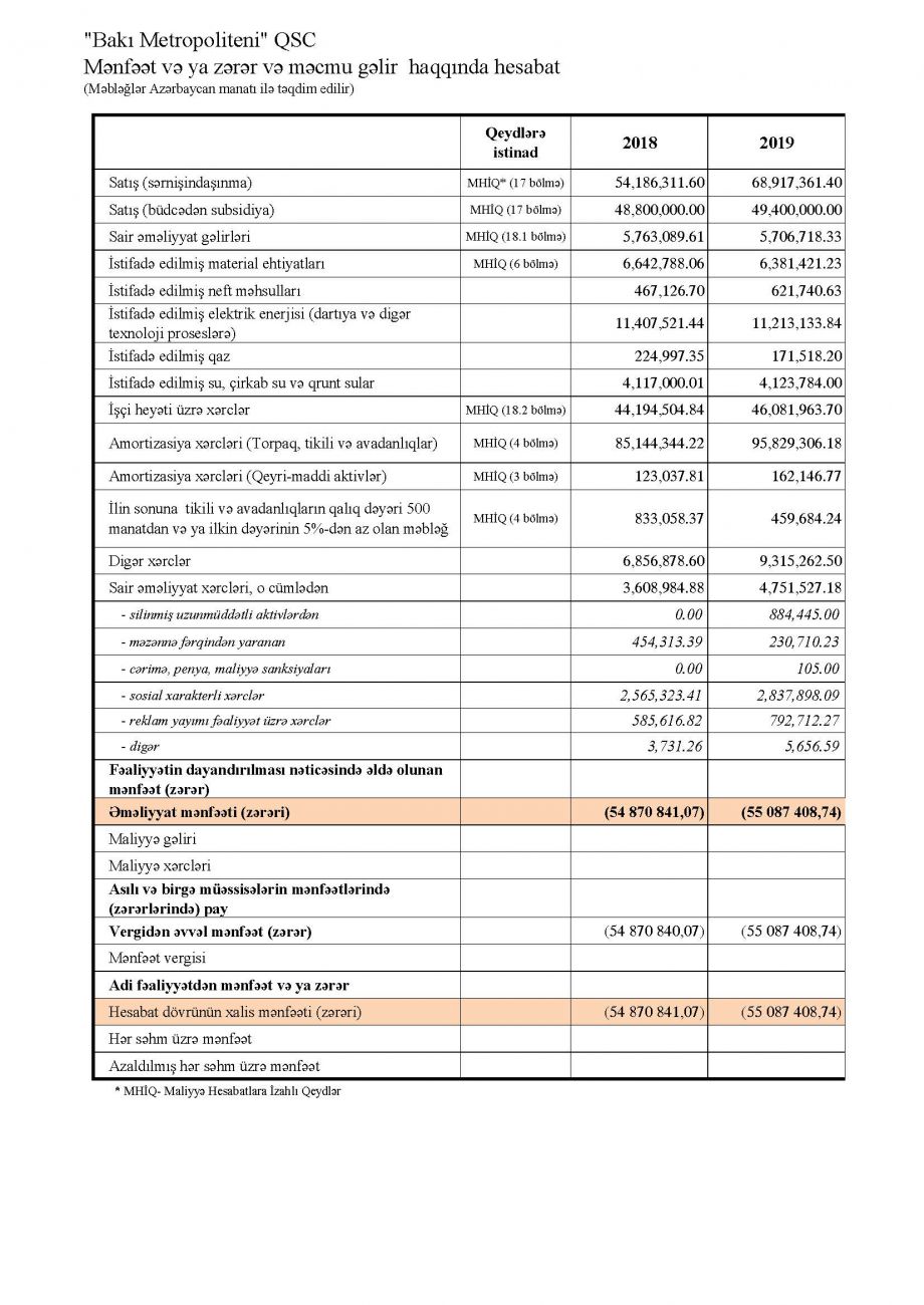 “Bakı Metropoliteni” QSC 2019-cu ili 55,1 milyon manat zərərlə başa vurub.