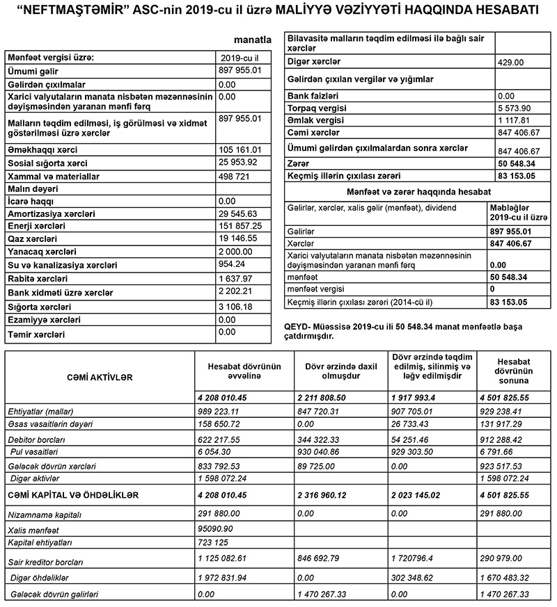 Qeyd edək ki, “Neftmaştəmir” 2018-ci ildə 859 min 182 manat gəlir əldə etsə də ili 89 min 997 manat zərər ilə bağlamışdı.