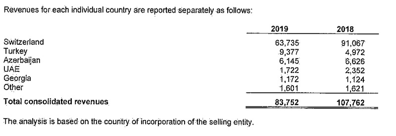 Ötən il SOCAR-ın cəmi gəlirlərinin azalması əsasən İsveçrədə əldə edilən gəlirlərin azalması ilə bağlıdır. 2018-ci illə müqayisədə 2019-cu ildə SOCAR-ın İsveçrədəki gəlirləri 27 milyard 332 milyon manat və ya 30% azalaraq 63 milyard 735 milyon manata düşüb. SOCAR 2019-cu ildə İsveçrə bazarından 91 milyard 67 milyon manat qazanmışdı.