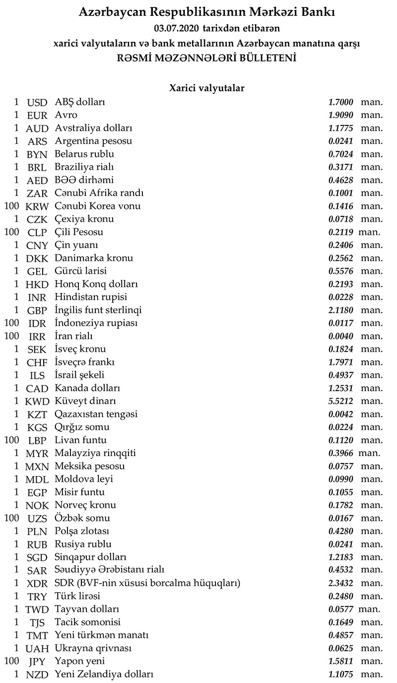 2020-ci ilin İyul ayının 03-nə Mərkəzi Bankın açıqladığı rəsmi Dollar/Manat məzənnəsi İyulun 02-si ilə müqayisədə dəyişməyərək 1,7000 manatda qalıb, Avro/manat məzənnəsi 1.9090 manata düşüb, Rubl/manat məzənnəsi isə 0,0241 manata yüksəlib.