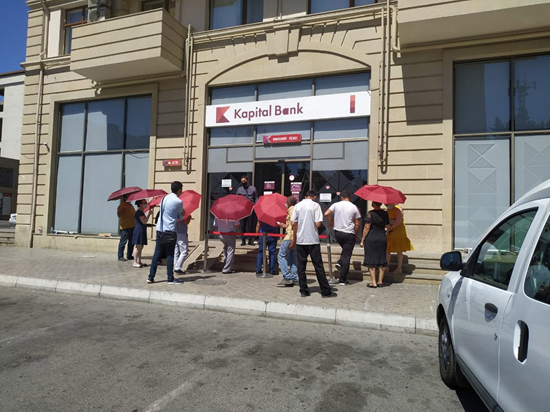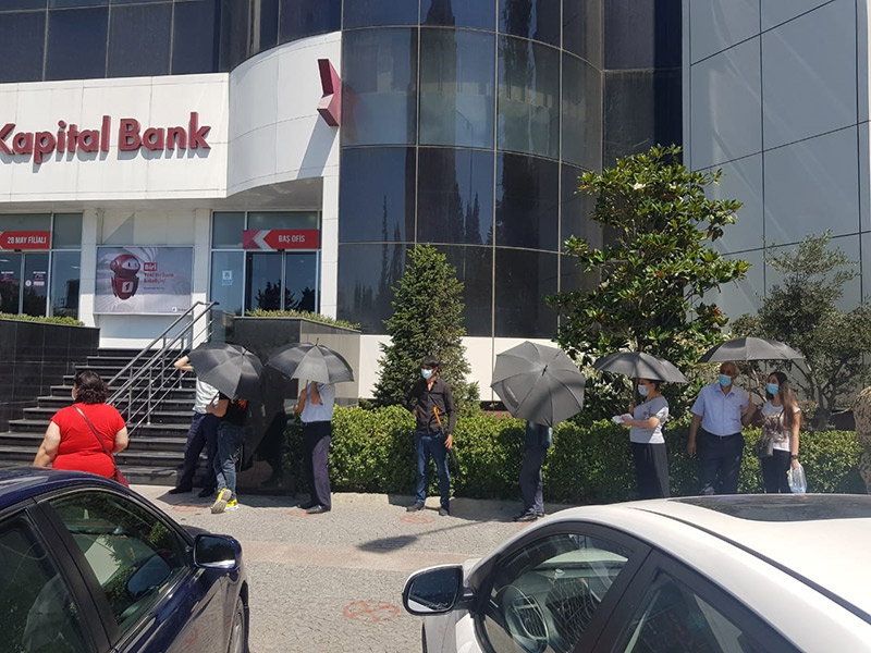 (®️) Kapital Bank koronavirusun (COVID-19) yayılması səbəbindən ölkədə xüsusi rejim tətbiq edildiyi üçün müştərilər üçün növbəti rahatlığı təmin edən tədbir həyata keçirib. Belə ki, havaların isti keçməsi və filiallara müştərilərin növbəli şəkildə buraxılması səbəbindən filialların önündə gündən qorunmaq üçün xüsusi çətirlər paylanılır.