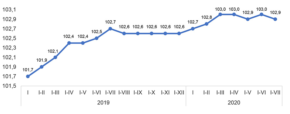 2020-ci ilin yanvar-iyul aylarında (7 ayda) illik inflyasiya 2,9 faiz təşkil edib. İnflyasiya ilk 6 ayda 3% təşkil etmişdi.2020-ci ilin yanvar-iyul aylarında istehlak qiymətləri indeksi 2019-cu ilin yanvar-iyul aylarına nisbətən 2,9 faiz, o cümlədən ərzaq məhsulları, içkilər və tütün məmulatları üzrə 5,3 faiz, qeyri-ərzaq məhsulları üzrə 1,3 faiz, əhaliyə göstərilmiş ödənişli xidmətlər üzrə 1,0 faiz artıb.