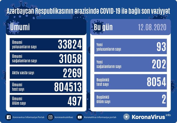 Son sutka ərzində yeni yoluxma hallarının müəyyənləşdirilməsi ilə əlaqədar 8 054, ötən müddət ərzində isə ümumilikdə 804 513 test aparılıb.