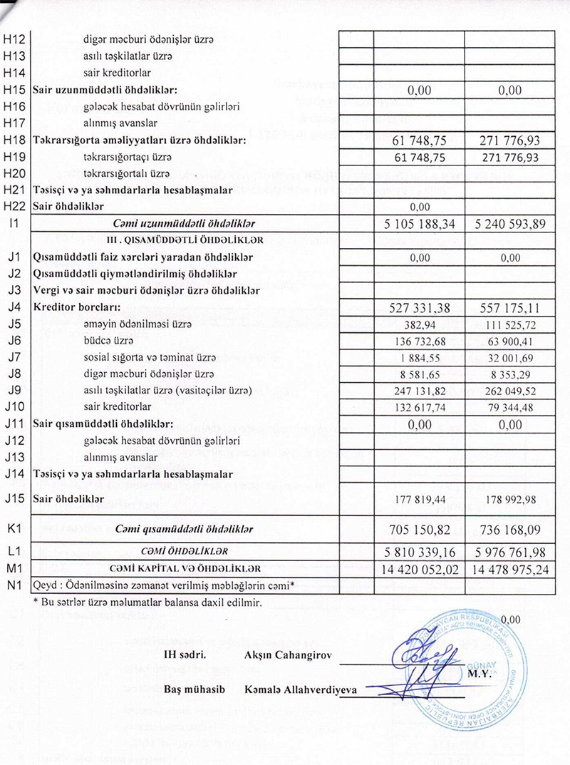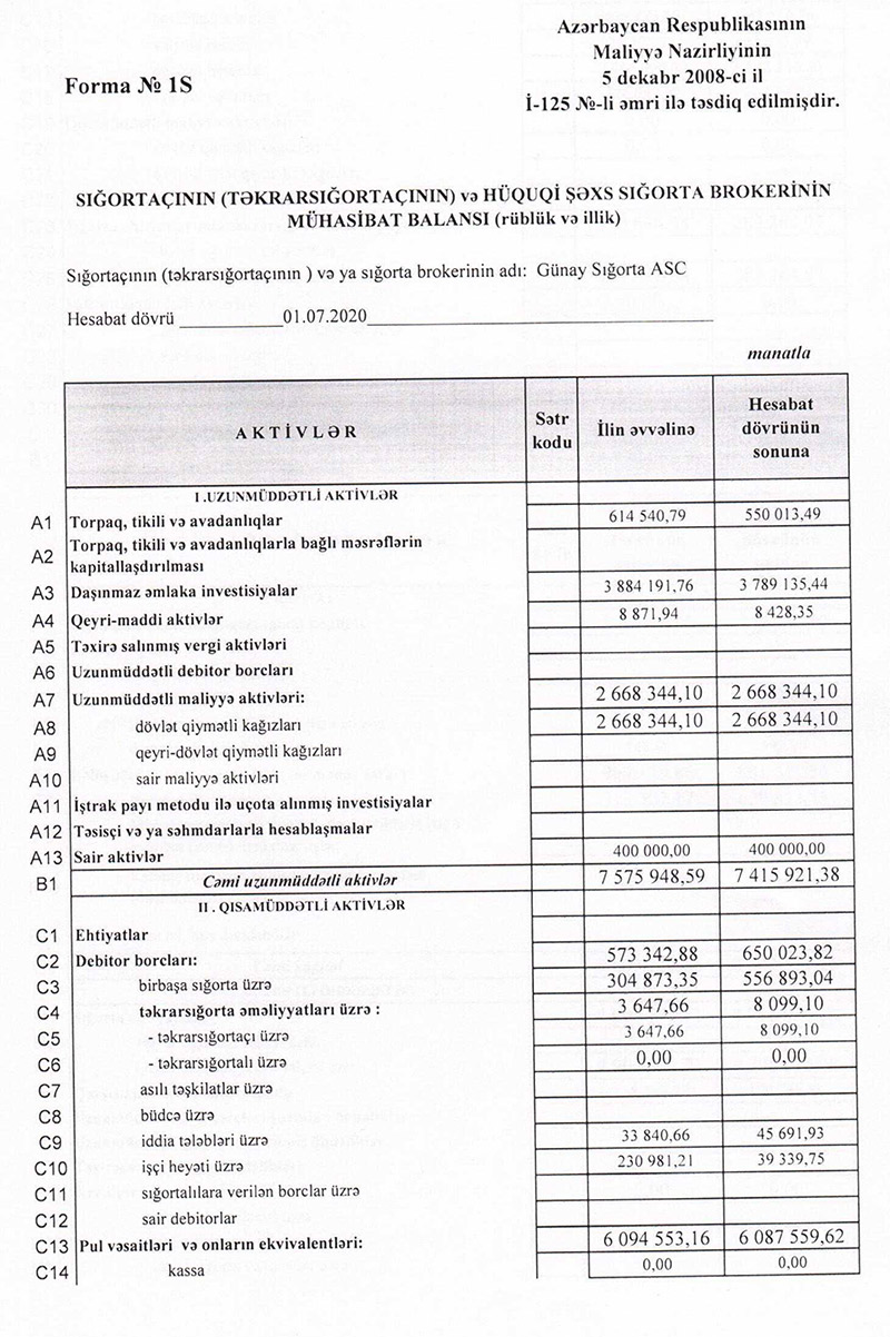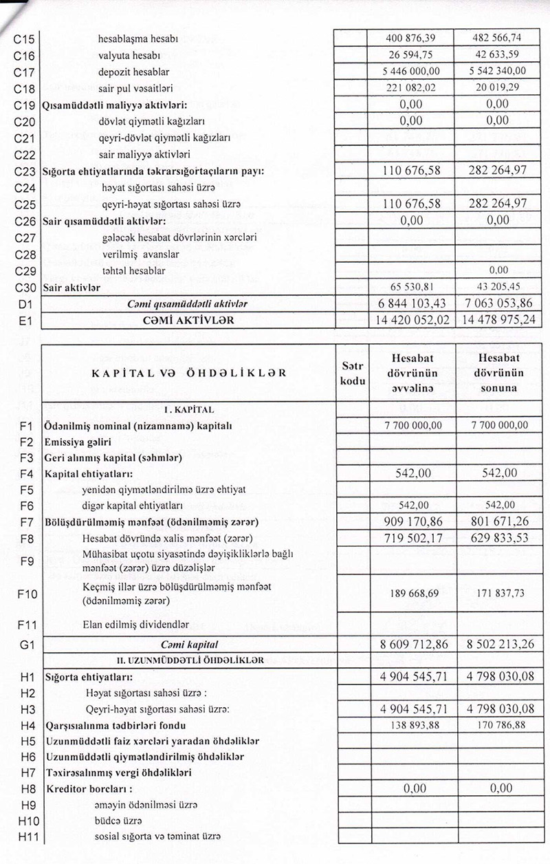 Bu il iyulun 1-nə "Günay Sığorta"nın aktivləri 14 milyon 479 min manat olub ki, bu da 1 il əvvələ nisbətən 10,45% çoxdur. Hesabat dövründə şirkətin öhdəlikləri 25% artaraq 4 milyon 977 min manata, balans kapitalı isə 2,1% artaraq 8 milyon 502 min manata çatıb.