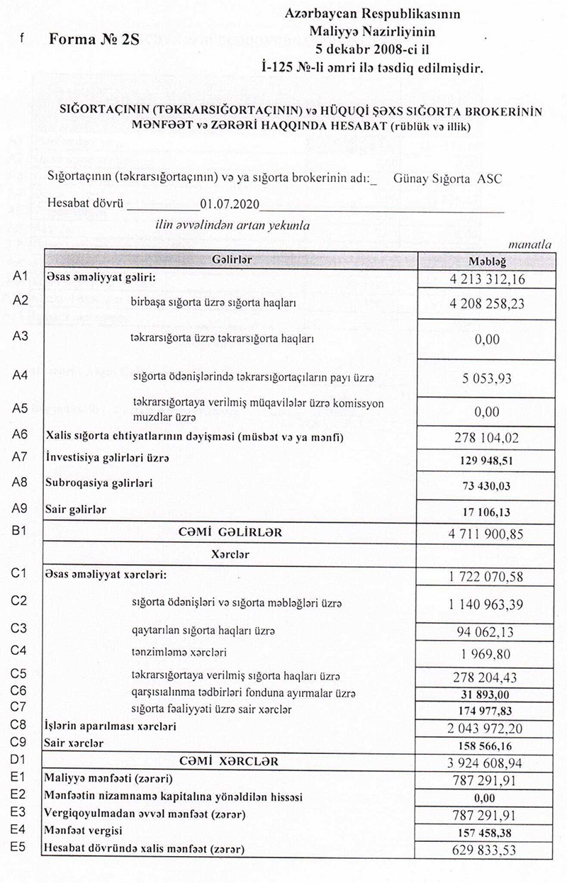 2020-ci ilin anvar-iyun aylarında "Günay Sığorta"nın gəlirləri 4 milyon 712 min manat (illik müqayisədə 56,45% çox), xərcləri 3 milyon 925 min manat (52,55% çox), mənfəət vergisi ödəmələri isə 157 min manat (1 il bundan əvvəl vergi ödəməyib) təşkil edib.